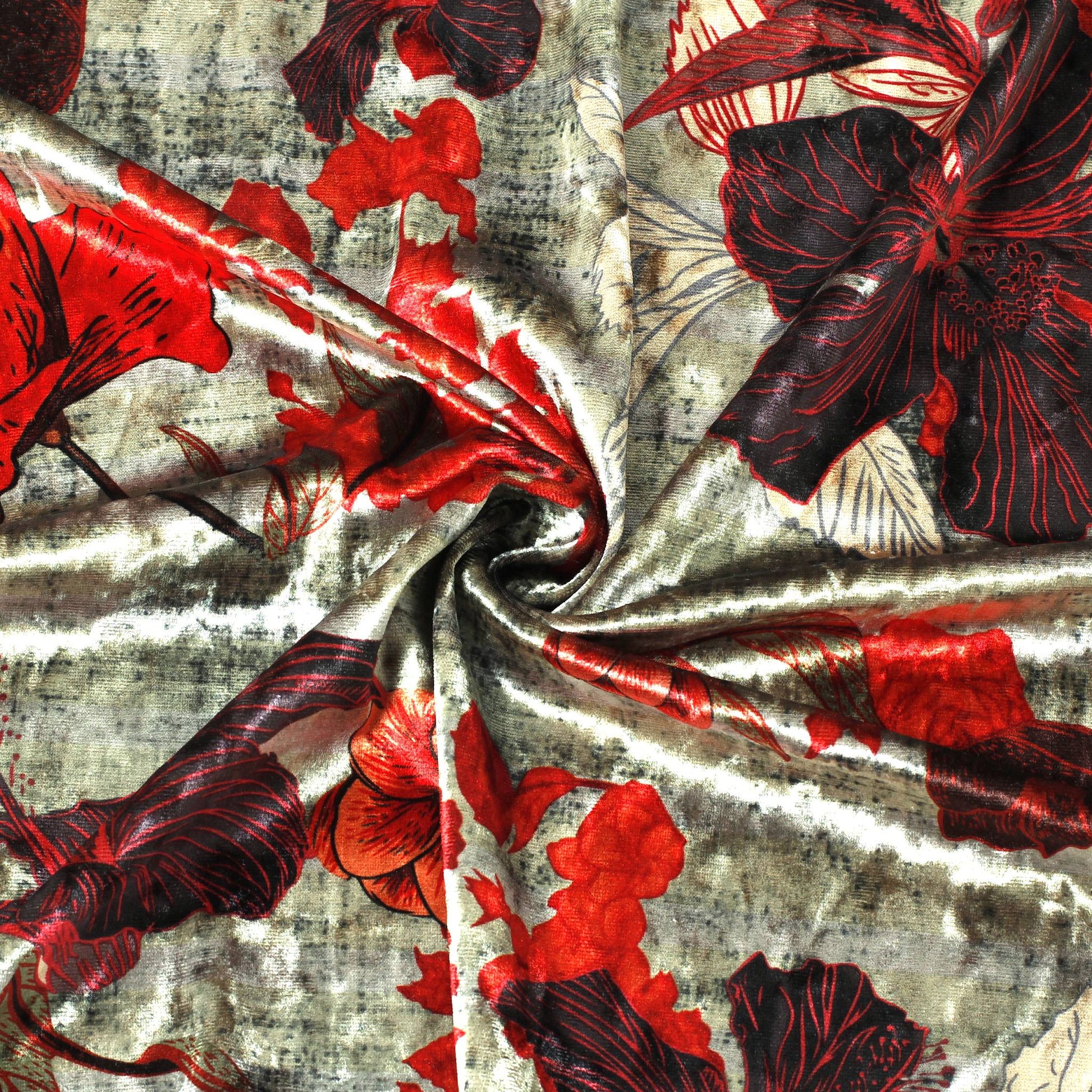 Shiny velvet with a bright flower printed on a pale neutral background. This print stands out as well as being touchably soft.