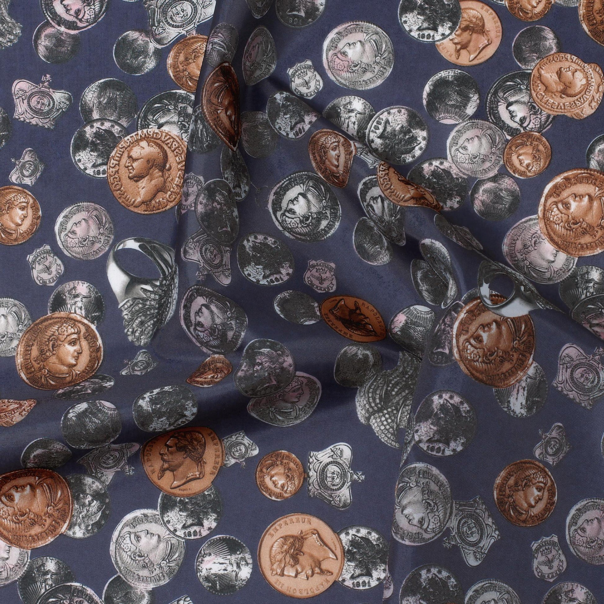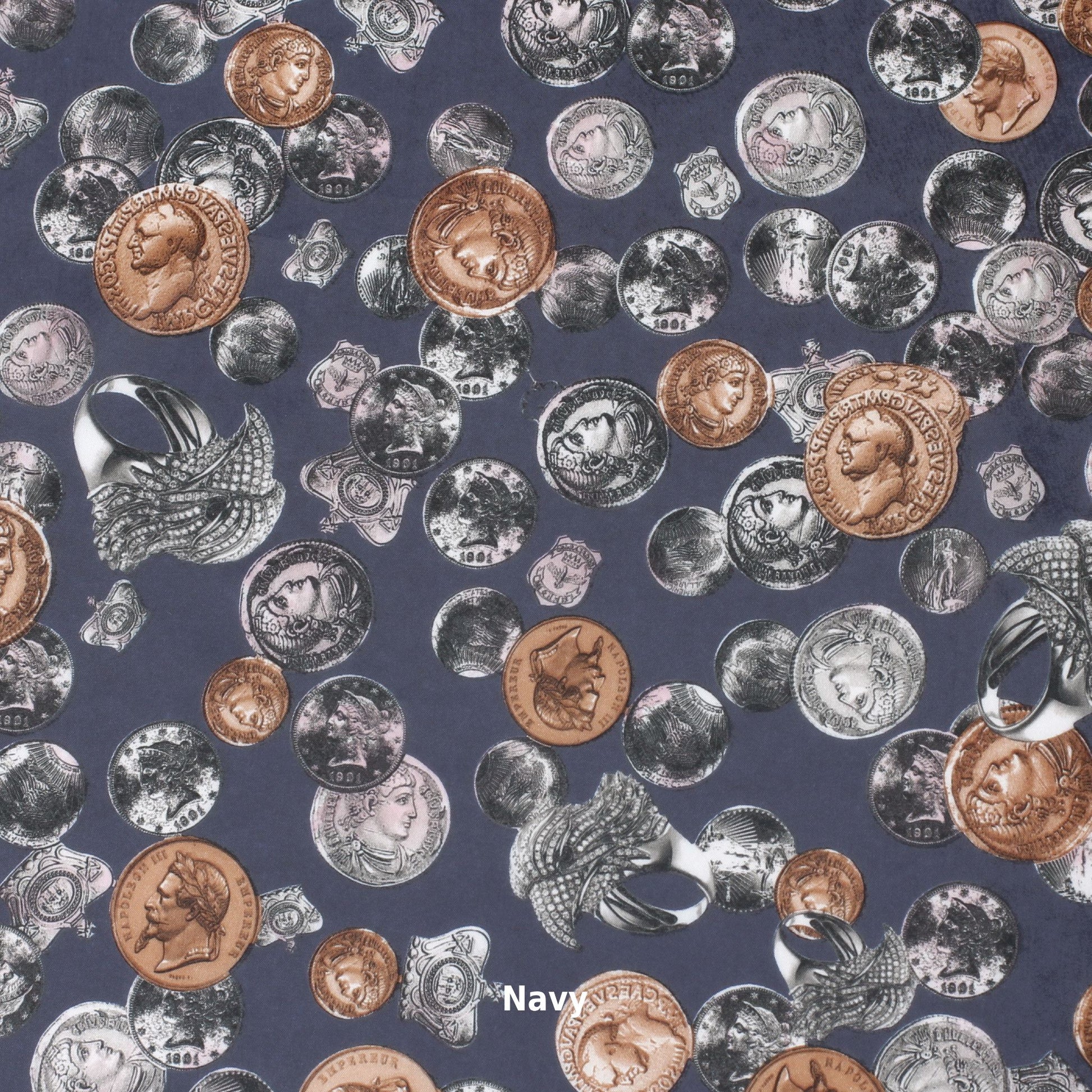 210T taffeta lining with a vintage coin design printed on a navy background. The base fabric is strong, smooth and slightly firm.